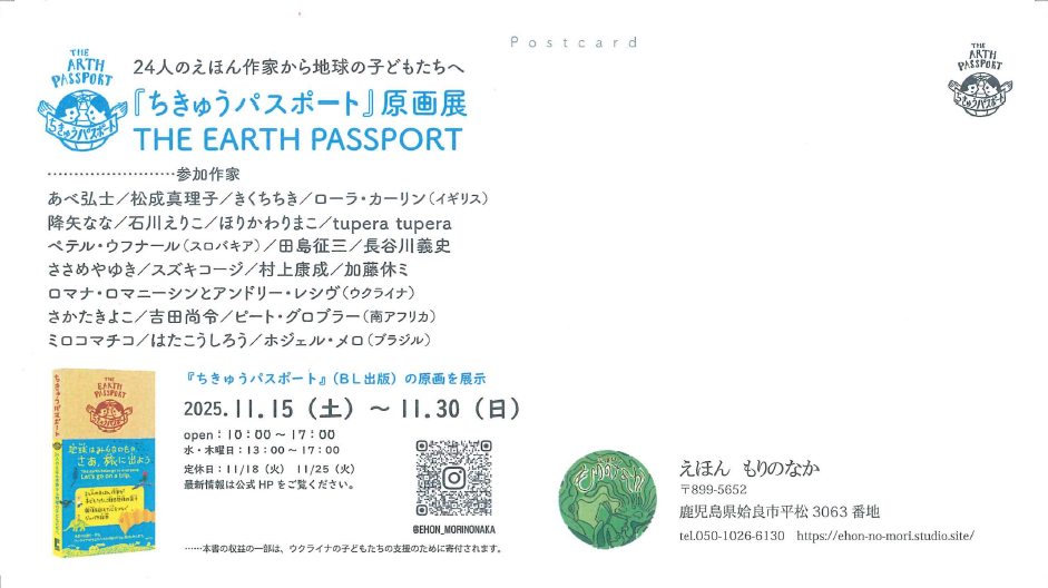 姶良市の絵本屋「えほん もりのなか」にて『ちきゅうパスポート』原画展を開催します。戦火にまき込まれたウクライナの子どもたちに「何かできることはないか」との作家たちの想いから作られた絵本。日本を含む6か国24人が参加、その収益の一部はウクライナの子どもたちの支援のために寄付されます。