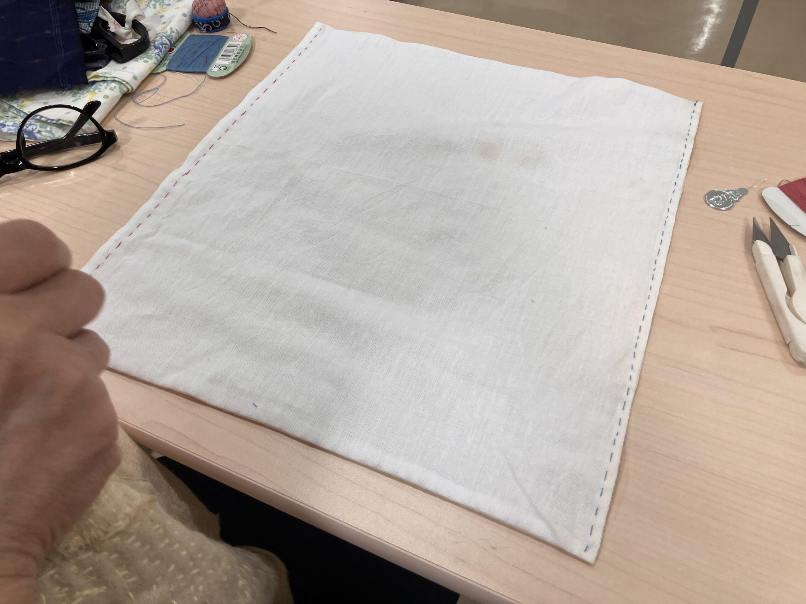 今回は「1本取り」という方法で、布巾の端をチクチク縫っていきます。