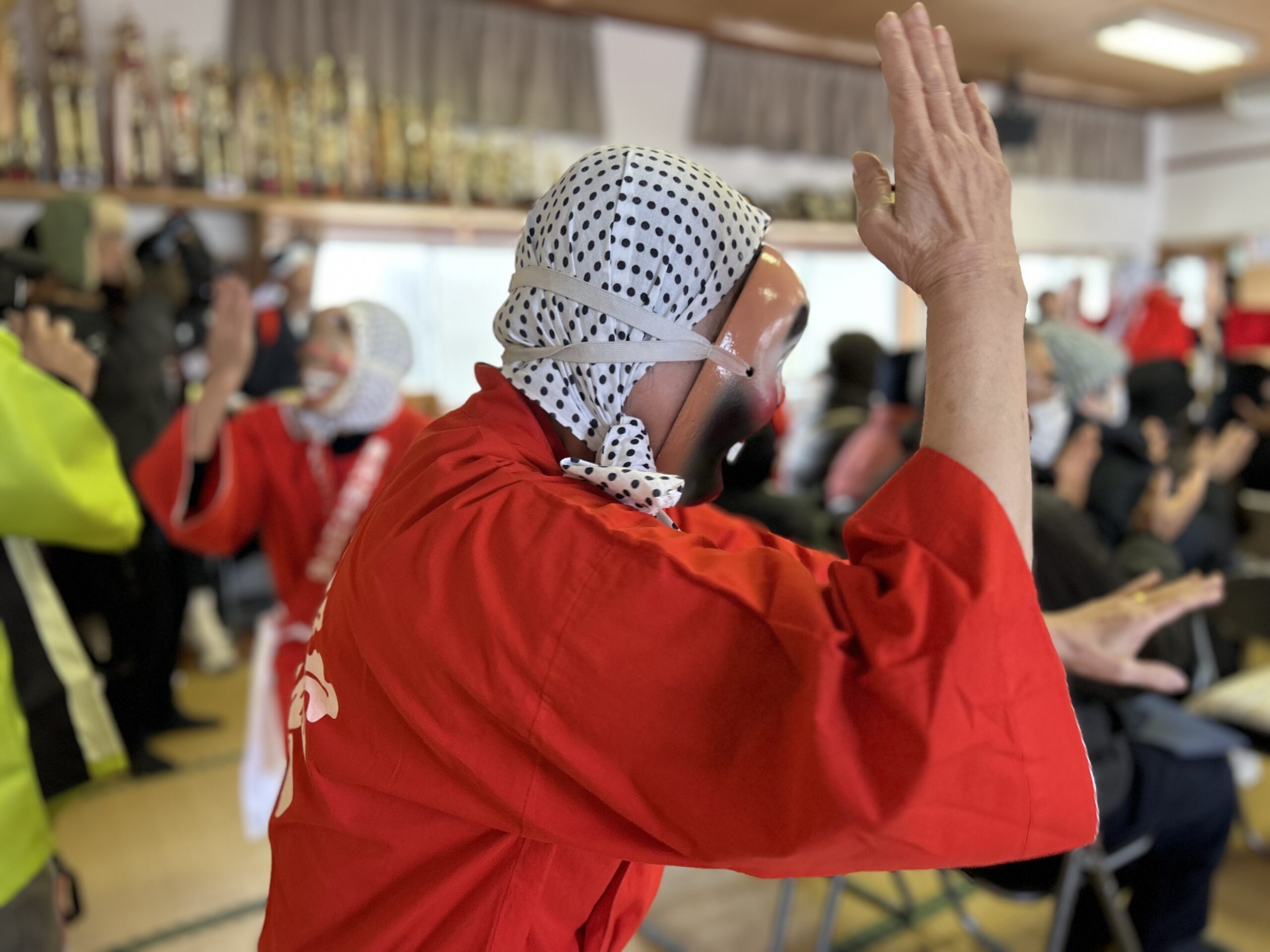 二月祭りでは、五穀豊穣や無病息災を願って奉納される「皆房棒踊り」のほか、あいご会による子どもたちの合唱や地元高校生の落語、日向ひょっとこ踊りなども披露される。今年は大雪の影響で演目が一部短縮されたものの、会場には終始笑顔があふれていた。